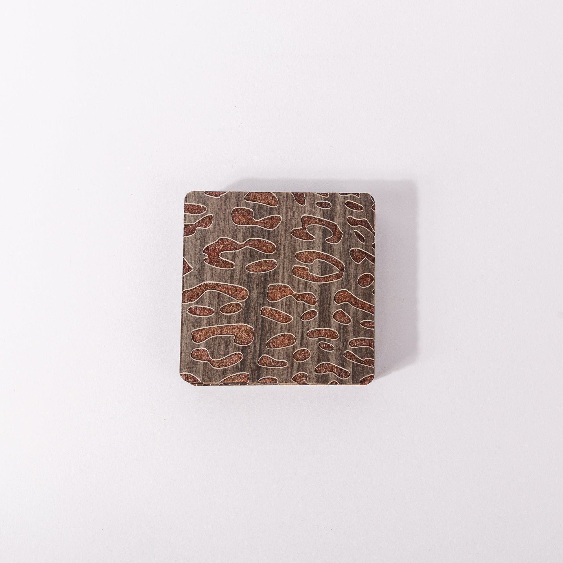 Each coaster features a precision-engraved top layer with a cheetah print cutout, revealing the warm, earthy tones of the natural wood beneath. The dual-tone design blends dark, brushed woodgrain with rich reddish-brown accents, adding a touch of contemporary artistry to your home décor. A protective sealer shields the wood from water damage, while a canvas base prevents slipping. Whether you’re entertaining guests or enjoying a quiet coffee break, these coasters provide both style and surface protection.