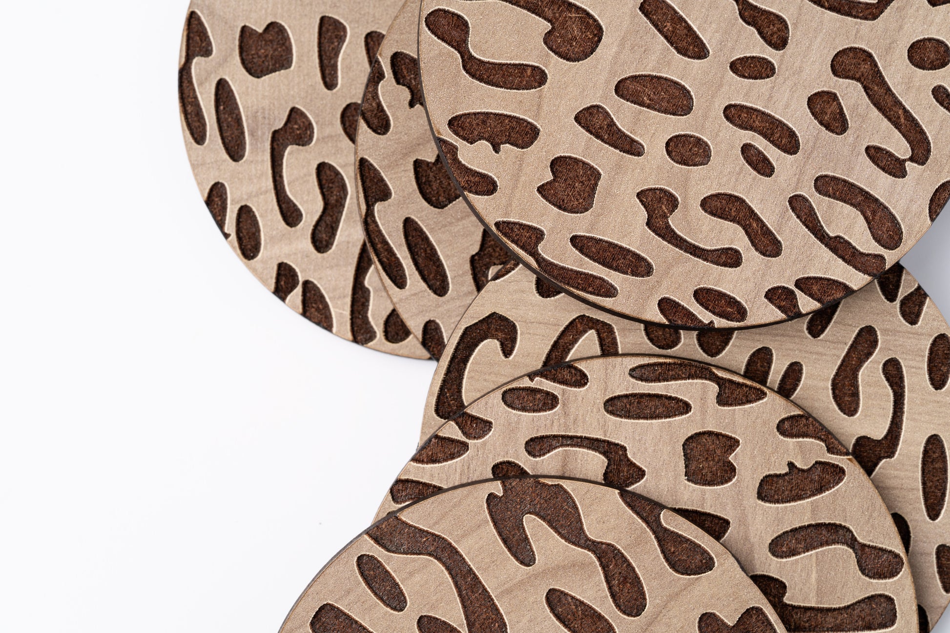 Each coaster features a precision-engraved top layer with a cheetah print cutout, revealing the warm, earthy tones of the natural wood beneath. The dual-tone design blends dark, brushed woodgrain with rich reddish-brown accents, adding a touch of contemporary artistry to your home décor. A protective sealer shields the wood from water damage, while a canvas base prevents slipping. Whether you’re entertaining guests or enjoying a quiet coffee break, these coasters provide both style and surface protection.